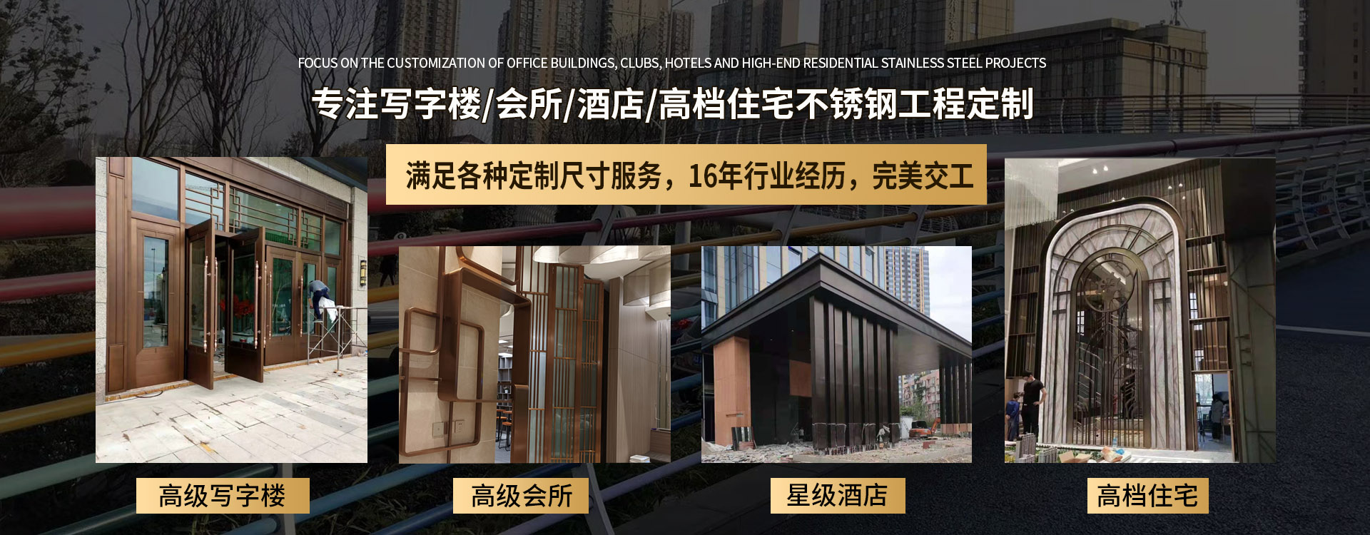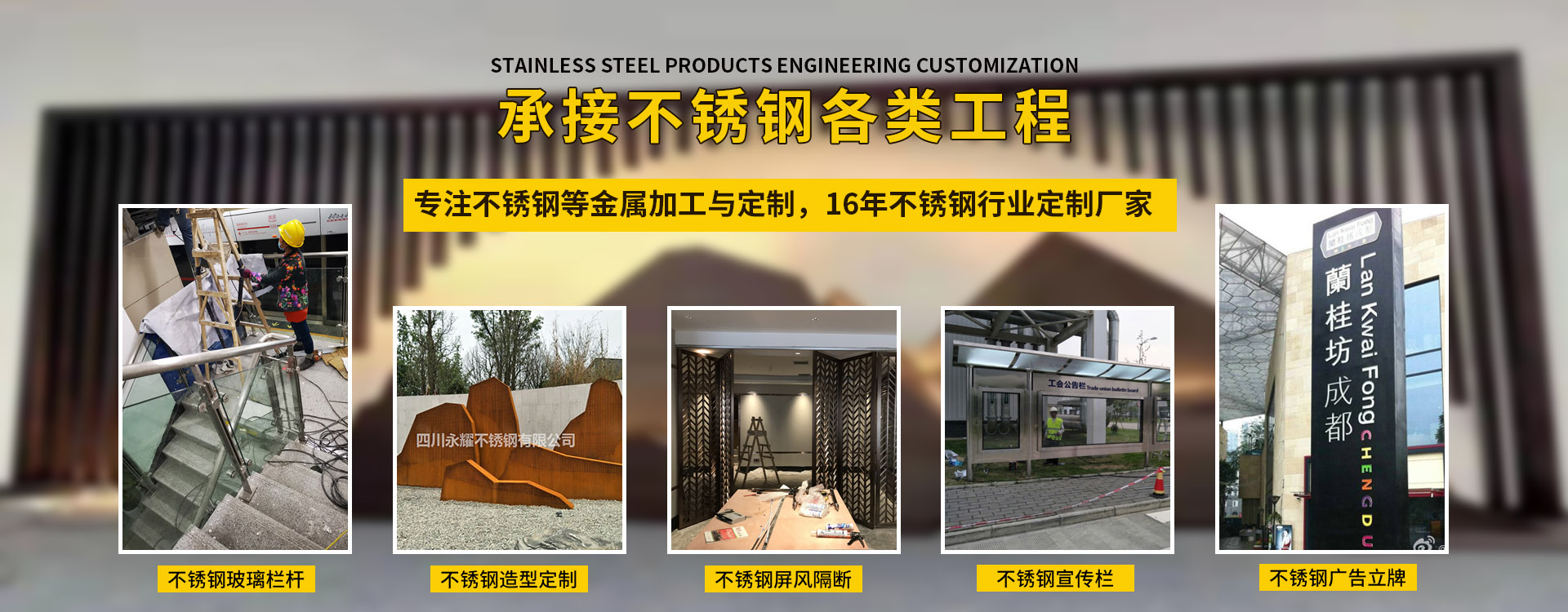 四川永耀不銹鋼有限公司是一家集開發(fā)、設(shè)計、加工、制作、安裝、并承接各種不銹鋼工程為一體的綜合性企業(yè)。多年來一直在專注于不銹鋼等金屬的加工與研發(fā)。在客戶群體中贏得了良好的聲譽(yù),以專業(yè)專注的精神,致辭力于打造良好的產(chǎn)品和企業(yè)形象,對每一產(chǎn)品傾注全力,力爭每個細(xì)節(jié)精細(xì),確保產(chǎn)品具有優(yōu)越的性能,優(yōu)美的外觀及優(yōu)良的品質(zhì),使公司產(chǎn)品深受廣大用戶的親睞。 本公司主要業(yè)務(wù): 一、工程類 承攬:酒店、銀行、商鋪、寫字樓、公寓、城鐵、地鐵、公交、機(jī)關(guān)、 學(xué)校、廣場藝術(shù)雕塑、自動門、旋轉(zhuǎn)門、廣告欄、公